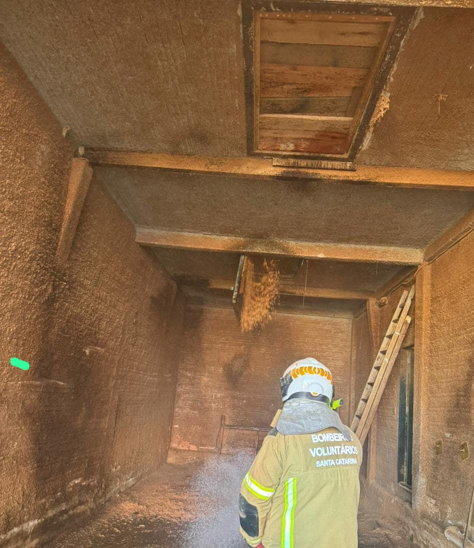 Incêndio atinge madeireira no Centro de Jaguaruna e mobiliza bombeiros