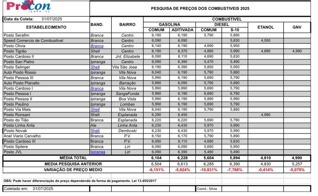 O Programa de Proteção e Defesa do Consumidor de Içara realizou, na última semana, uma pesquisa de preços de combustíveis nos postos da cidade. De acordo com a coordenadora do Procon, Silvia Mendes, a gasolina comum, um dos combustíveis mais consumidos, apresentou uma diferença de até 6,2% entre o menor e o maior valor. O preço mais baixo foi encontrado por R$ 5,79 o litro. Já o valor mais alto foi registrado a R$ 6,15.