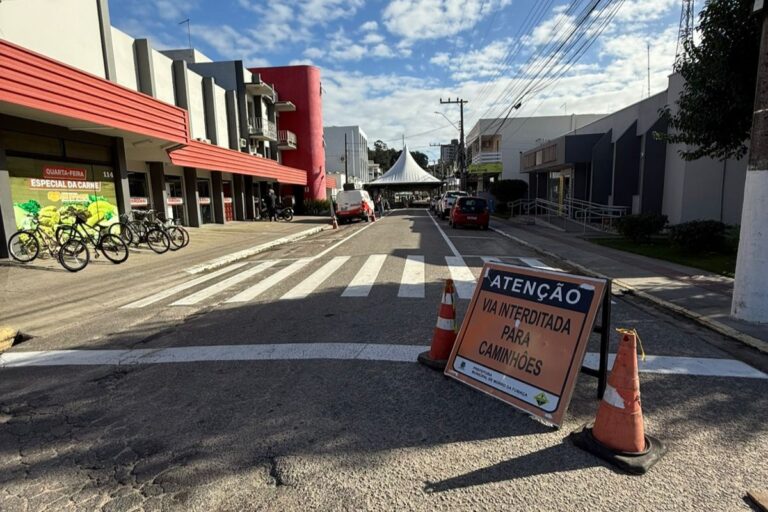 A rua 15 de Novembro, no Centro de Morro da Fumaça, que recebe a montagem das estruturas da Praça Maggiofest e da Praça de Alimentação,