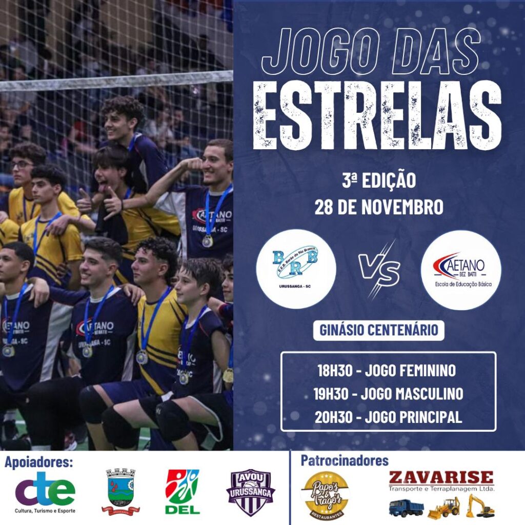 A 3ª edição do Jogo das Estrelas será realizada nesta sexta-feira (28), no Ginásio Centenário, em Urussanga, reunindo as escolas Caetano Bez Batti e Barão do Rio Branco em uma noite de celebração do voleibol. O evento foi idealizado e é organizado pelo professor Gustavo de Lorenzzi, com apoio da Prefeitura de Urussanga, Secretaria de Cultura, Turismo e Esporte, Diretoria de Esportes e das direções das duas instituições de ensino.