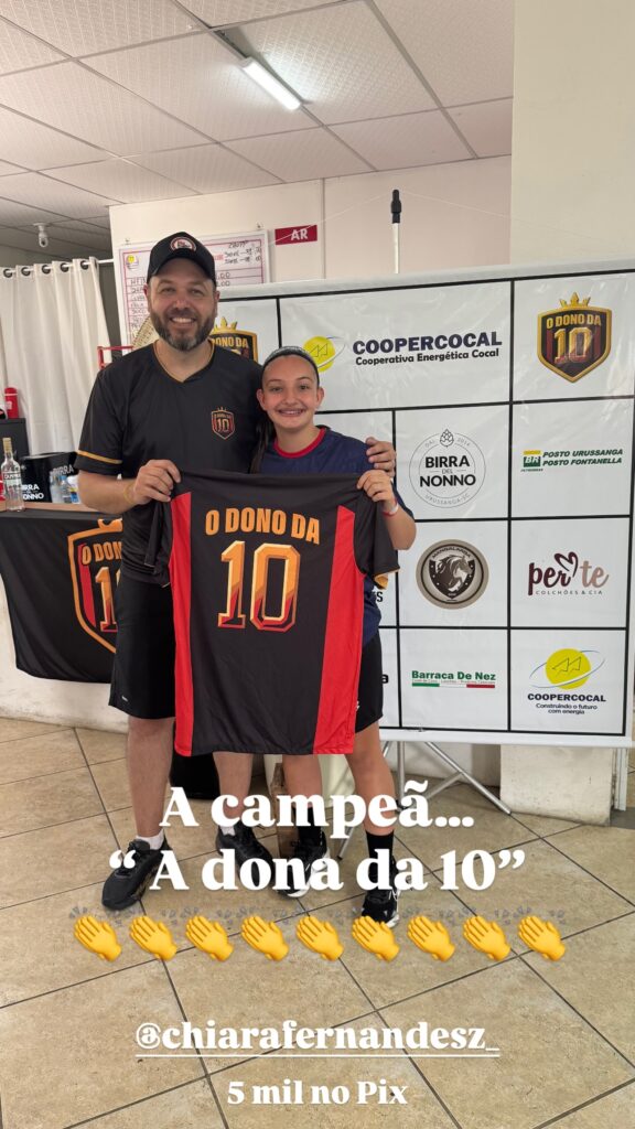 A manhã deste domingo (9) foi de muita disputa e diversão no Estádio Lydio De Brida, em Urussanga, com a realização da competição “O Dono da 10”, evento que reuniu atletas e apaixonados por futebol de toda a região. E, contrariando o nome, a “dona” da 10 foi uma mulher: Chiara Fernandesz, atleta do Criciúma Esporte Clube, conquistou o primeiro lugar na competição.