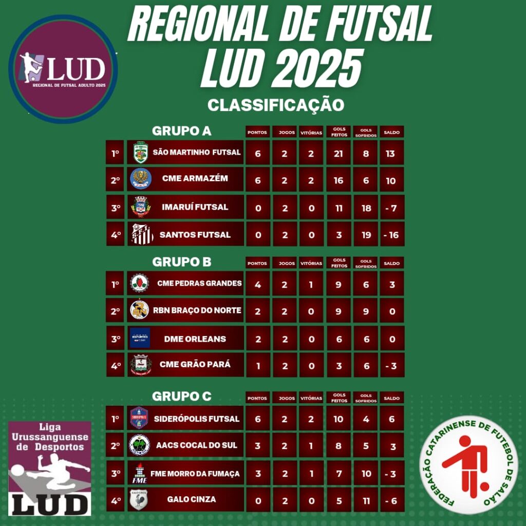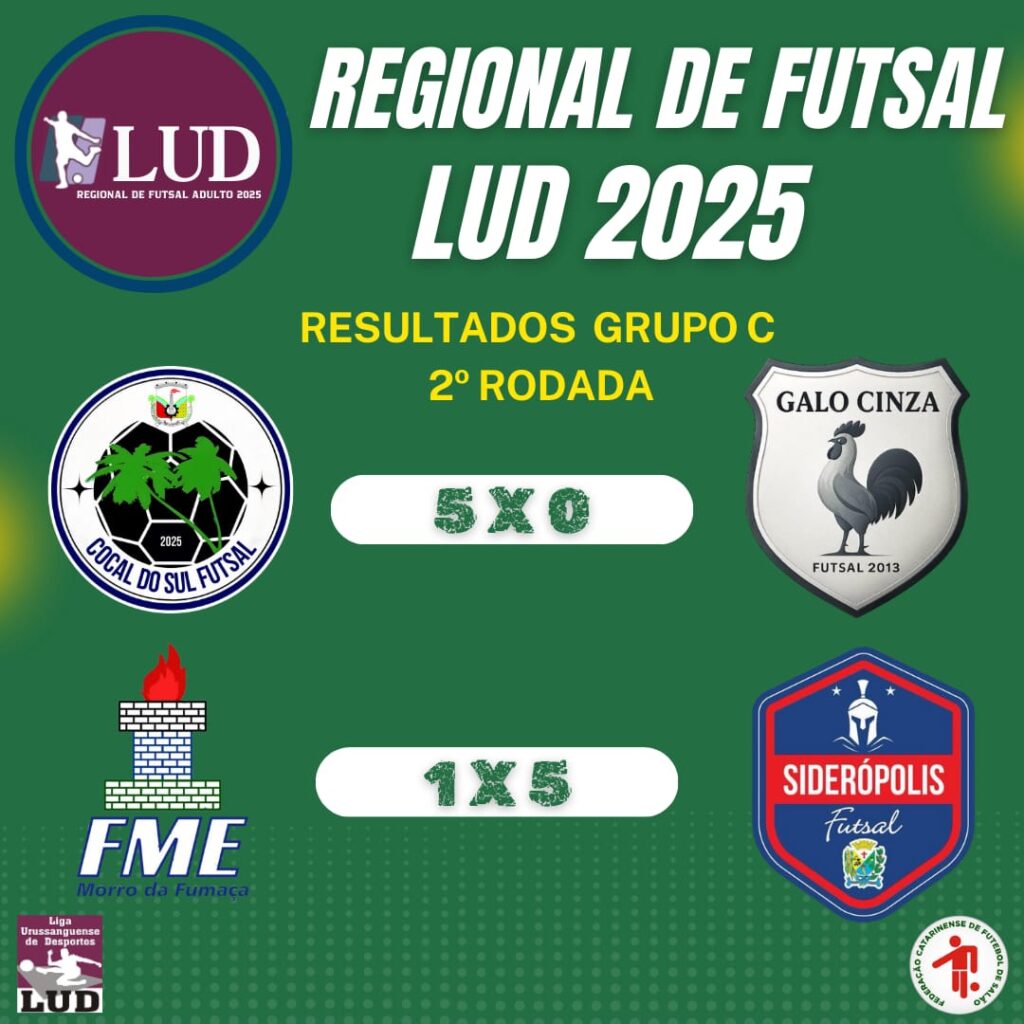 A segunda rodada do Campeonato Regional de Futsal Adulto da LUD 2025 foi marcada por grandes jogos e muitos gols, mas o destaque negativo ficou por conta da goleada sofrida pelo Galo Cinza de Urussanga, que foi derrotado por 5 a 0 pela equipe de Cocal do Sul, fora de casa. O resultado coloca o time urussanguense em situação delicada no Grupo C da competição.