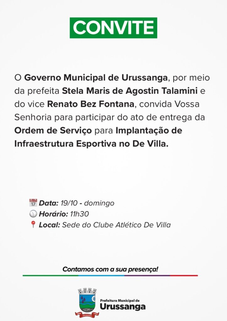A Prefeitura de Urussanga fará neste domingo (19), às 11h, a entrega da ordem de serviço para o início das obras de melhorias na infraestrutura do Clube Atlético De Villa. As obras serão feitas pelo Município com parte dos recursos repassados por emenda parlamentar da deputada federal Júlia Zanatta (PL), viabilizada pelo vereador Ivan Vieira (PL).