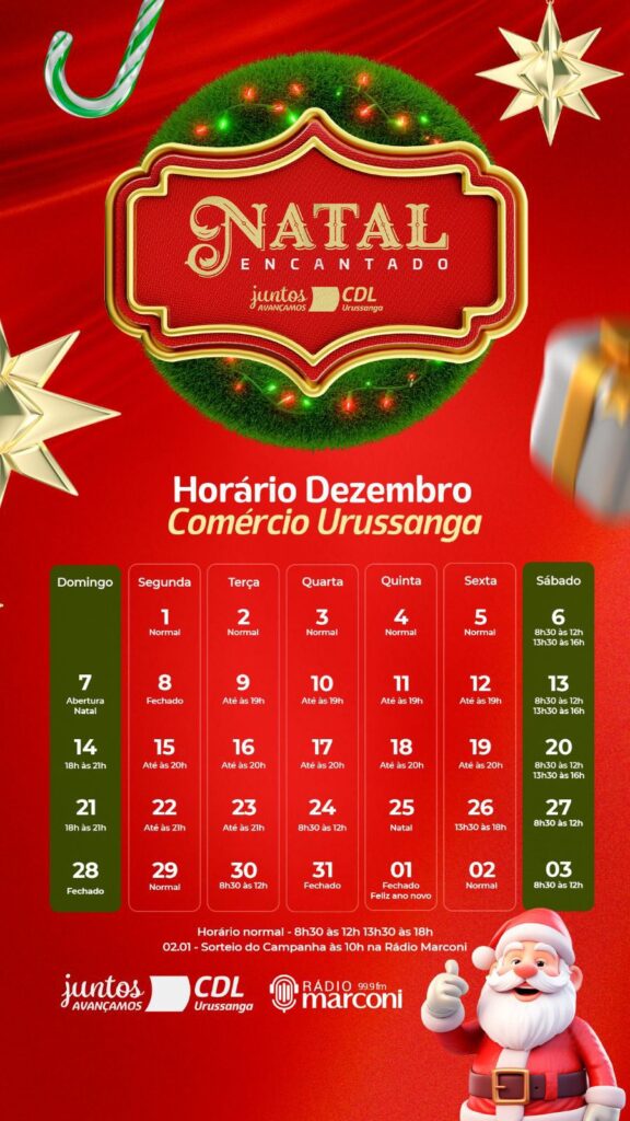 A Câmara de Dirigentes Lojistas (CDL) de Urussanga anunciou oficialmente o horário de funcionamento do comércio durante o Natal Encantado 2025. Segundo o presidente da entidade, Leonardo Felippe, a definição ocorreu de forma democrática, em assembleia com votação entre os comerciantes associados.
