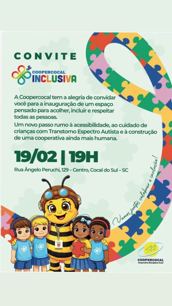 A Coopercocal dará mais um passo importante em direção à inclusão e ao cuidado com as pessoas. Na próxima quinta-feira (19) às 19 horas, será inaugurado o Centro de Atendimento e Terapias Coopercocal Inclusiva, um espaço pensado com carinho para atender crianças e adolescentes com Transtorno do Espectro Autista (TEA), filhos de associados da cooperativa.