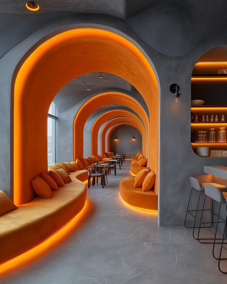 • Uma loja com detalhes em laranja que transmite energia e dinamismo, incentivando compras impulsivas.