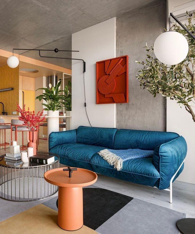Sala de estar com paredes neutras, mas móveis, almofadas e objetos coloridos, mostrando como a paleta vai além da tinta