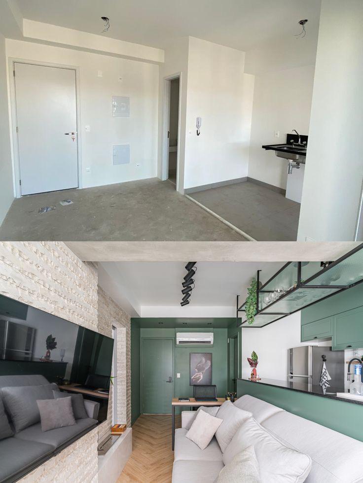Montagem mostrando antes e depois de um mesmo espaço com diferentes paletas – Projeto de CAE Arquitetura e Interiores – Pinterest