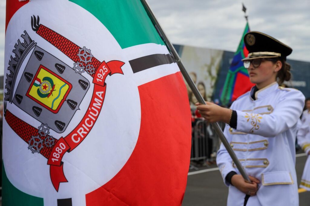 Antes do início do desfile, o público acompanhou o hasteamento das bandeiras, realizado durante a execução do hino nacional brasileiro, de Criciúma e da independência, interpretados pela banda do 28° Grupo de Artilharia e Campanha (GAC), em conjunto com alunos das Escolas Municipais de Educação Básica (EMEBs) Augusto Pavei, Professor Francisco Skrabski e Antônio Colombo, representando todos os estudantes da rede municipal de ensino.