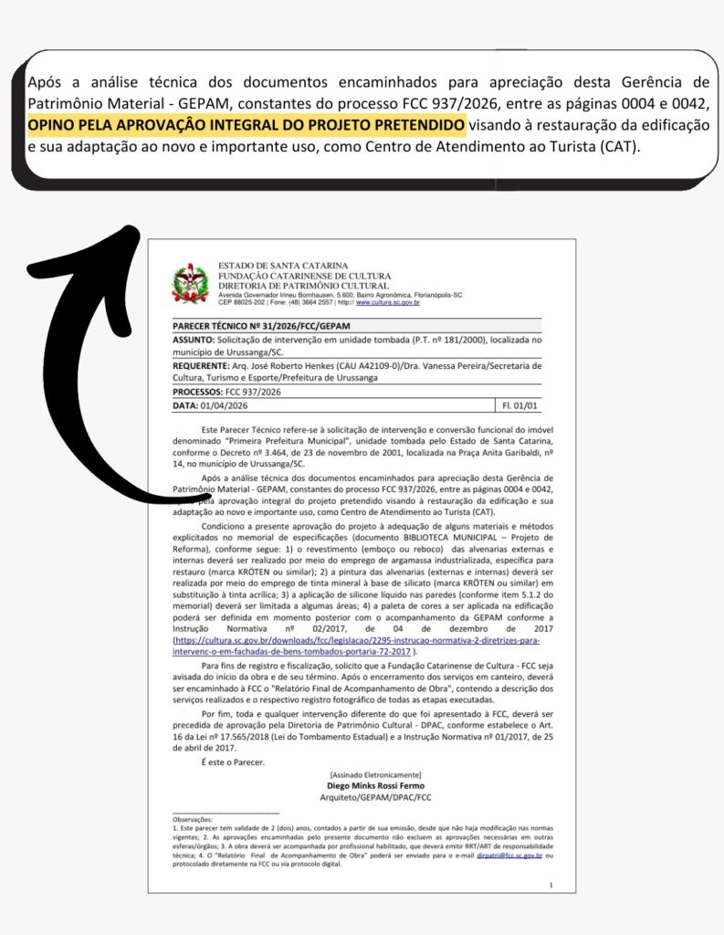 A Fundação Catarinense de Cultura (FCC) aprovou o projeto de implantação do Centro de Atendimento ao Turista (CAT) em Urussanga. O parecer técnico nº 31/2026, emitido pela Diretoria de Patrimônio Cultural, autoriza a restauração e adaptação de um imóvel tombado para uso turístico. O CAT será instalado no prédio histórico que abrigou a primeira sede da Prefeitura Municipal, na região central da cidade.