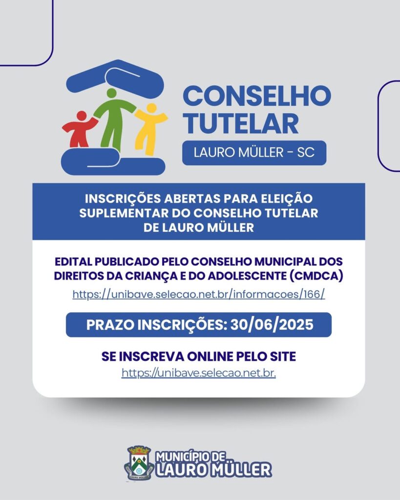 Seguem até o dia 30 de junho, as inscrições para o processo seletivo suplementar que irá escolher novo membro para o Conselho Tutelar de Lauro Müller, além da formação de cadastro de reserva. O edital foi publicado pelo Conselho Municipal dos Direitos da Criança e do Adolescente (CMDCA), e as inscrições podem ser feitas de forma online, pelo site https://unibave.selecao.net.br.