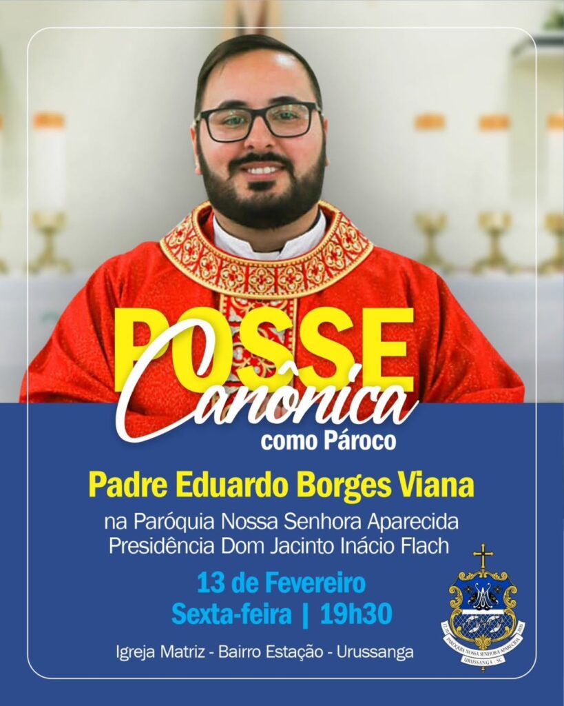 A Paróquia Nossa Senhora Aparecida, no bairro da Estação, em Urussanga, promove na sexta-feira (13) a Missa de Posse Canônica do padre Eduardo Borges, que assumirá oficialmente a função de pároco da comunidade. A celebração está marcada para as 19h30 e simboliza o início de uma nova etapa na organização pastoral da paróquia.
