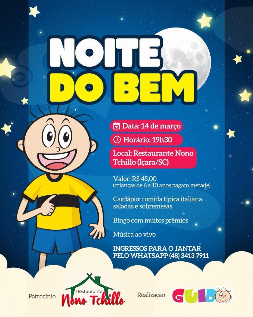 A Casa Guido está promovendo a primeira edição da Noite do Bem, que será um jantar beneficente para arrecadar fundos para a entidade. O evento será realizado no dia 14 de março, no Restaurante Nono Tchillo, localizado na Rodovia ICR 253, Segunda Linha – Içara, a partir das 19h30. Os ingressos (que são limitados) podem ser adquiridos através do Whatsapp (48) 3413-7911, no valor de R$ 45,00.
