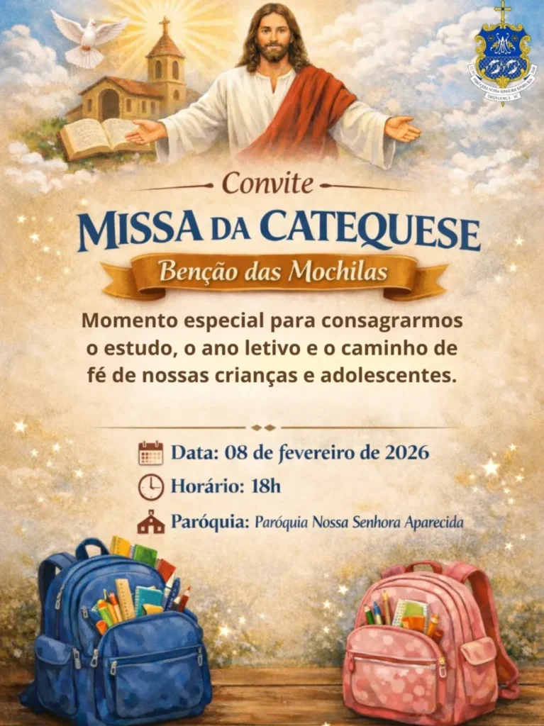 A Paróquia Nossa Senhora Aparecida promove neste domingo (8), às 18h, uma celebração especial voltada às crianças, adolescentes e jovens: a Missa da Catequese com a Bênção das Mochilas. O encontro convida catequizandos, pais, catequistas e toda a comunidade a levarem as mochilas escolares para receber uma oração de proteção e cuidado para o ano letivo, que inicia oficialmente na segunda-feira (9).