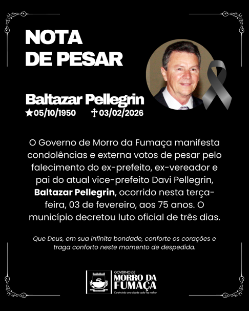 O Governo de Morro da Fumaça manifesta condolências e externa votos de pesar pelo falecimento do ex-prefeito do município, ex-vereador e pai do atual vice-prefeito Davi Pellegrin, Baltazar Pellegrin, aos 75 anos, ocorrido nesta terça-feira, 03 de fevereiro.