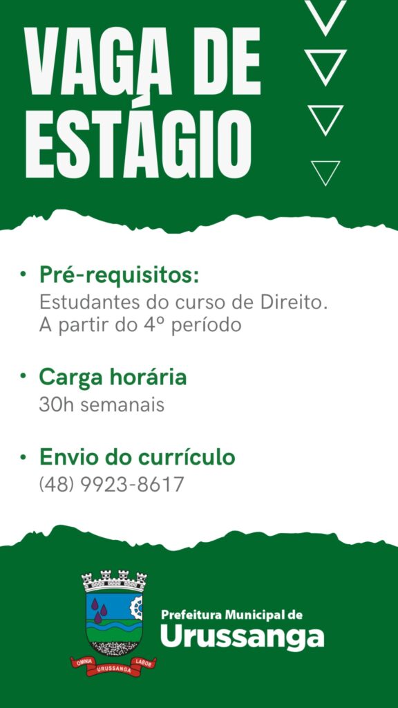 A Prefeitura de Urussanga está com vaga de estágio aberta para estudantes do curso de Direito. Podem se candidatar acadêmicos a partir do 4º período, que desejem adquirir experiência prática na área jurídica.