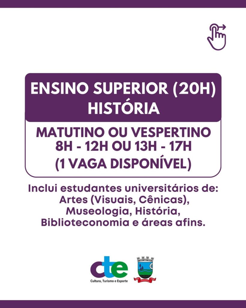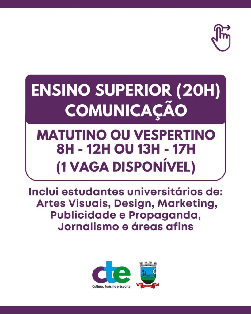Oportunidades são para a Secretaria de Turismo, Cultura e Esporte, com carga horária de 20 horas semanais