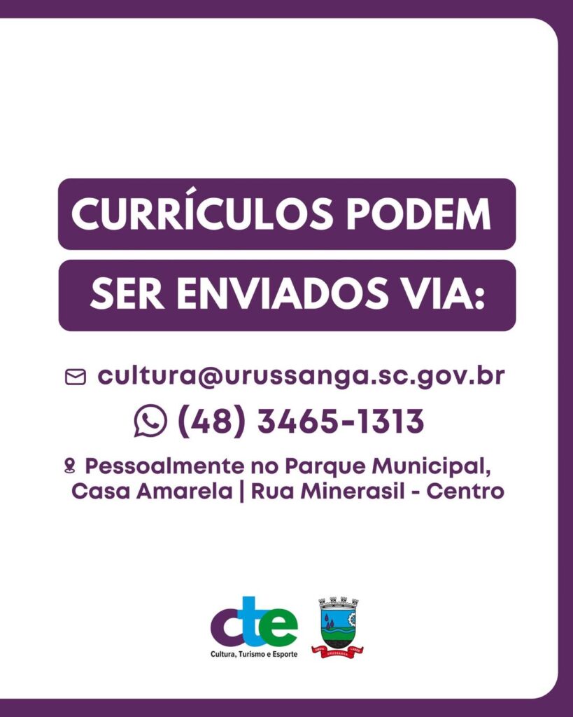 Os interessados podem encaminhar o currículo pelo e-mail cultura@urussanga.sc.gov.br, pelo WhatsApp (48) 3465-1313 ou entregar pessoalmente no Parque Municipal, na Casa Amarela.