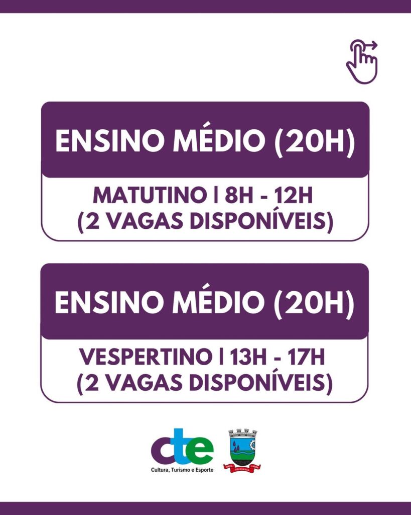 Para o ensino médio, estão disponíveis quatro vagas, sendo duas no período matutino, das 8h às 12h, e duas no período vespertino, das 13h às 17h, todas com carga horária de 20 horas semanais.