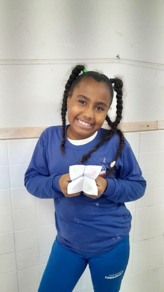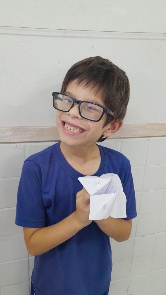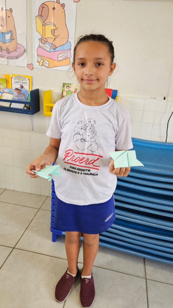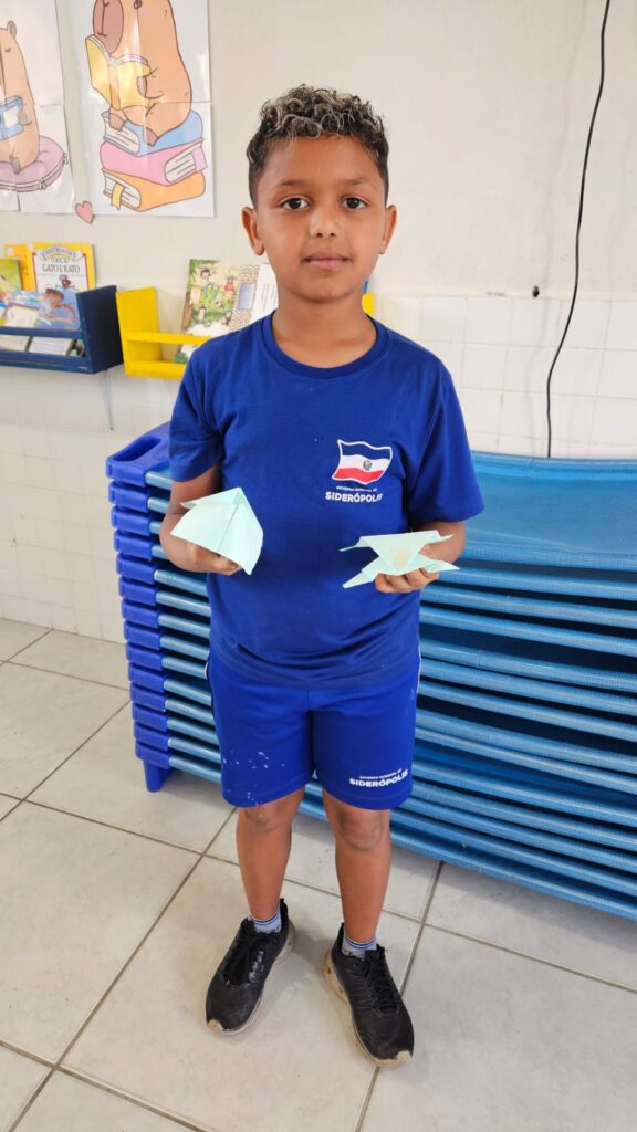 Além disso, também realizaram dobraduras em origami, inspiradas no personagem Sukha, um passarinho que faz parte da história, desenvolvendo a concentração, a coordenação motora e a sensibilidade artística.
