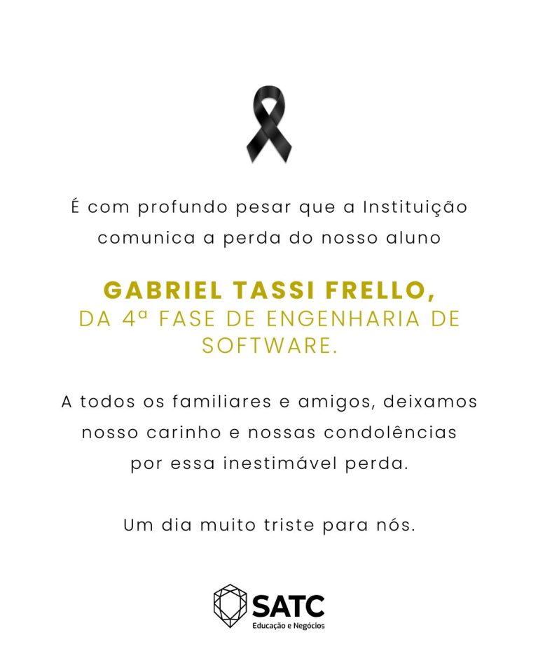 A Satc comunicou, com profundo pesar, o falecimento do estudante Gabriel Tassi Frello, 21 anos, acadêmico do curso de Engenharia de Software da UniSatc. A instituição manifestou solidariedade à família, amigos e a todos que conviveram com o jovem, lembrado pelo jeito alegre, pela energia e pelos sonhos que compartilhava.