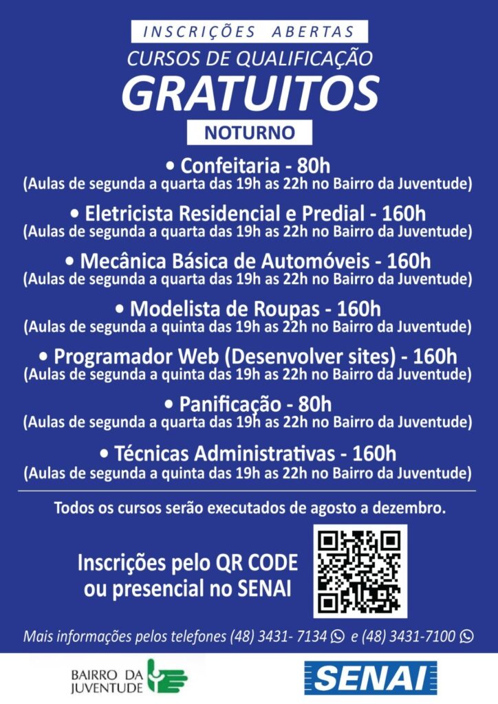 Ao todo, sete cursos serão oferecidos, todos com foco na inserção rápida dos participantes no mercado de trabalho. As inscrições estarão abertas de 14 de julho a 14 de agosto e podem ser feitas via QR Code (disponível no material de divulgação), por meio do link: https://forms.gle/oVcfLomnreTXR4Yj8 ou de forma presencial na unidade do SENAI Criciúma. Cada turma contará com 30 vagas, preenchidas por ordem de inscrição.