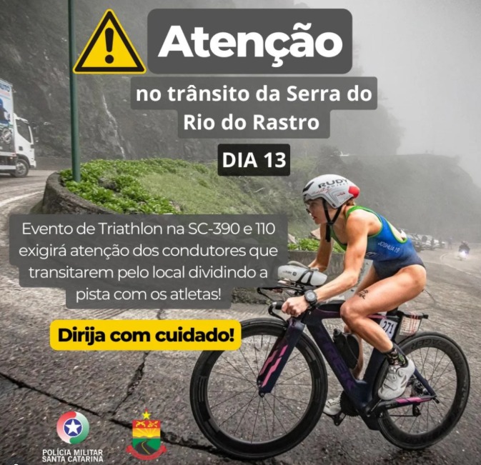 A Polícia Militar Rodoviária (PMRv) emitiu um alerta sobre mudanças no tráfego neste sábado (13) devido à realização da etapa de ciclismo do Triathlon na Serra do Rio do Rastro, abrangendo a SC-390 e o trecho da SC-110 até Urubici. A circulação ocorrerá entre 5h e 17h30.
