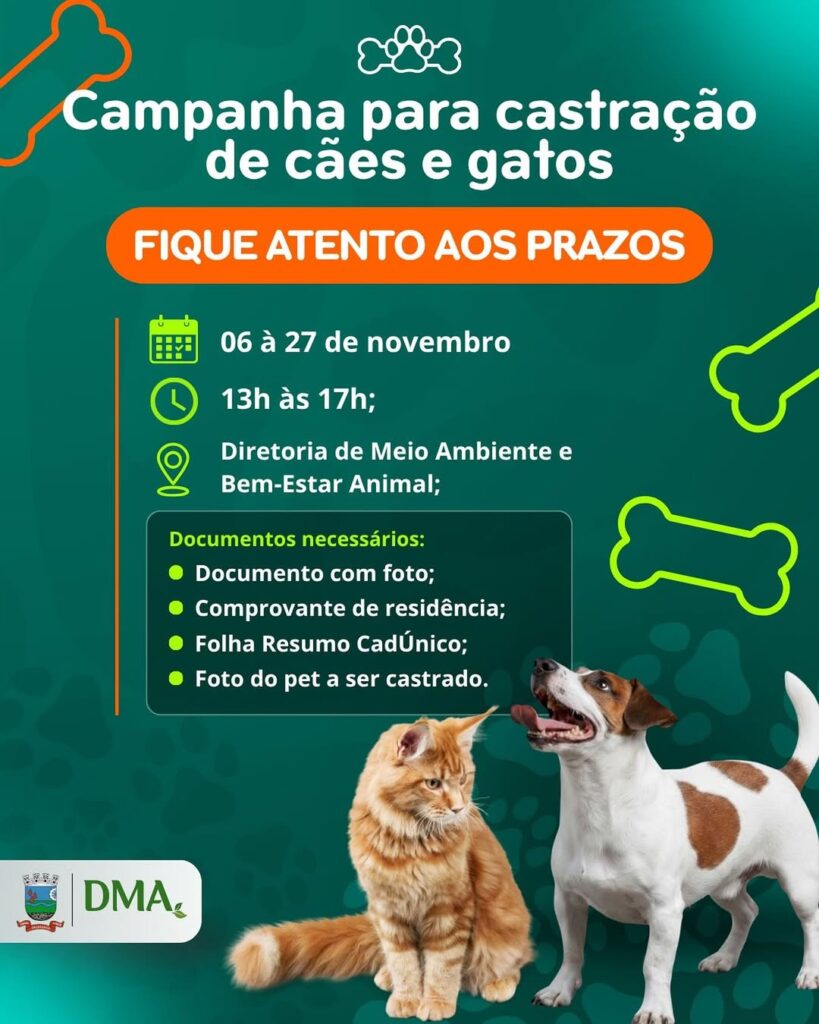 Começa nesta quinta-feira (6) o cadastramento para a próxima campanha de castração de cães e gatos em Urussanga. O processo segue até o dia 27 de novembro e é voltado a famílias inscritas no CadÚnico, com o objetivo de garantir o controle populacional e o bem-estar dos animais no município.