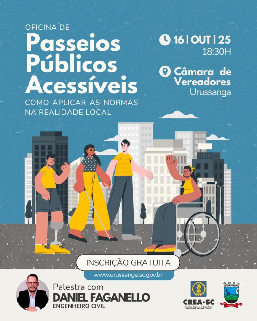 A acessibilidade nos passeios públicos será tema de uma oficina nesta quinta-feira, dia 16, em Urussanga. O evento, promovido pelo Governo Municipal por meio da Diretoria de Planejamento, em parceria com o Conselho Regional de Engenharia e Agronomia de Santa Catarina (Crea-SC), é gratuito e aberto ao público. A atividade acontece a partir das 18h30, na Câmara de Vereadores.