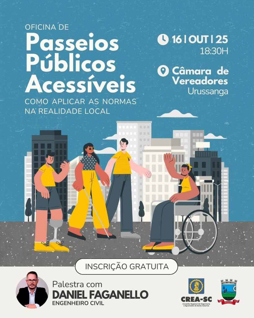 A Câmara de Vereadores de Urussanga vai sediar, no dia 16 de outubro, a Oficina de Passeios Públicos Acessíveis: Como aplicar as normas na realidade local. O evento é gratuito e tem início às 18h30, com credenciamento e café de boas-vindas, seguido da abertura oficial às 19h.