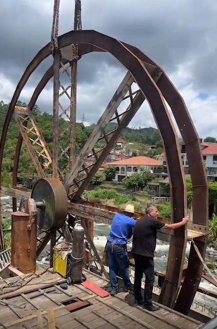 O Centro de Pedras Grandes ganhou, nesta sexta-feira (23), um novo marco histórico e turístico com a instalação de uma grande roda d’água, acompanhada de perto pelo prefeito Agnaldo Filippi. Construída inteiramente em aço da Ponte Hercílio Luz, a estrutura tem 10 toneladas e cerca de 10 metros de altura, e foi projetada para homenagear a indústria do passado dos colonizadores e a importância das quedas d’água no desenvolvimento da região.