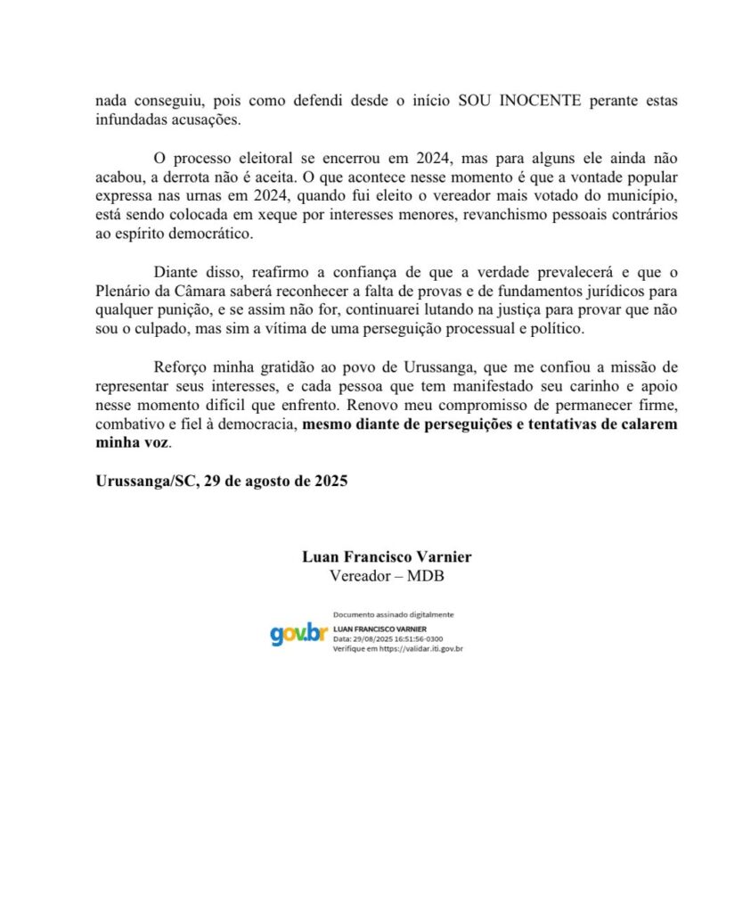 Logo após a decisão da Comissão de Investigação Processante (CIP) de Urussanga pela cassação de seu mandato, o vereador Luan Varnier (MDB) afirmou que o resultado foi motivado por interesses políticos. A comissão decidiu, por 2 a 1, pela cassação, contrariando o relatório do vereador Jaison Vieira (MDB), que havia recomendado o arquivamento do processo por não haver materialidade das acusações.
