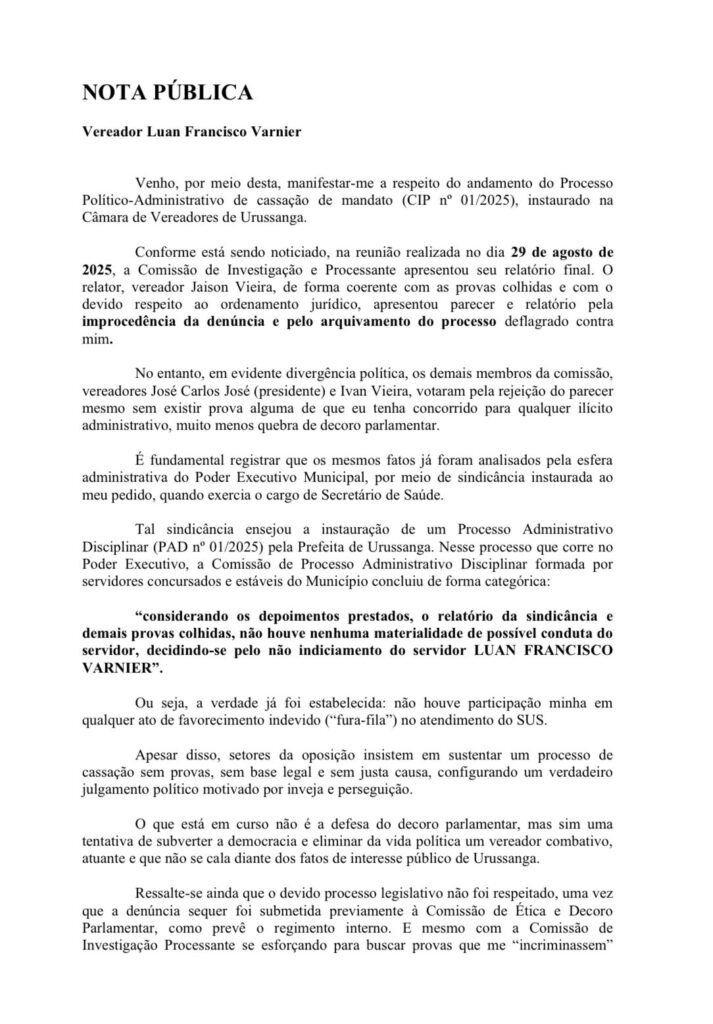 Além da entrevista, o vereador Luan Francisco Varnier também divulgou uma nota pública oficial nesta sexta-feira (29), em que detalha sua versão sobre o andamento do processo e contesta duramente a decisão da comissão.