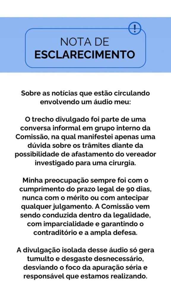“O trecho divulgado foi parte de uma conversa informal em grupo interno da Comissão, na qual manifestei apenas uma dúvida sobre os trâmites diante da possibilidade de afastamento do vereador investigado para uma cirurgia. Minha preocupação sempre foi com o cumprimento do prazo legal de 90 dias, nunca com o mérito ou com antecipar qualquer julgamento”, diz o texto.