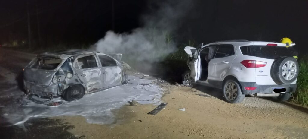 Um grave acidente de trânsito envolvendo dois automóveis mobilizou equipes de resgate na noite dessa quinta-feira (3), por volta das 21h57, na Rodovia Genésio Mazon, no bairro São Pedro, em Urussanga. Três pessoas ficaram feridas, entre elas uma adolescente de 16 anos, e um dos veículos foi completamente consumido pelas chamas.
