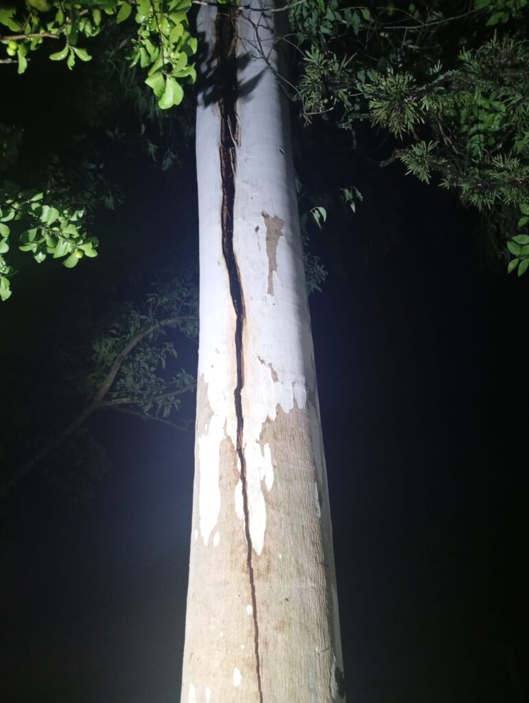 De acordo com o Corpo de Bombeiros, tratava-se de um eucalipto de aproximadamente 12 metros de altura, localizado em um terreno residencial, que apresentava uma grande rachadura ao longo do tronco, indicando possibilidade de queda a qualquer momento. Diante da situação e das condições climáticas, a guarnição realizou a evacuação preventiva de duas residências próximas.
