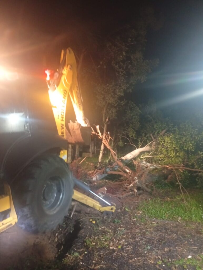Para eliminar o risco, os bombeiros contaram com o apoio da Defesa Civil e de um operador com retroescavadeira cedida pela Prefeitura. A árvore foi derrubada de forma controlada, sem causar danos aos imóveis vizinhos. Após a ação, a área foi considerada segura.