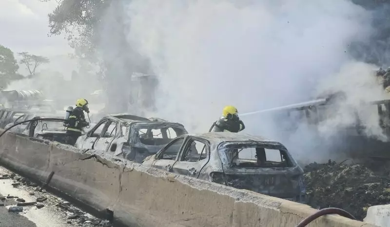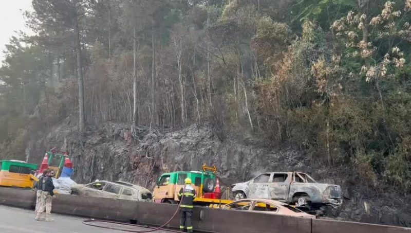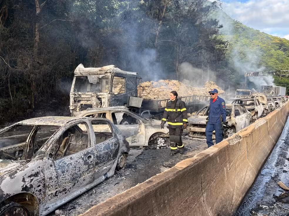 Segundo o Corpo de Bombeiros, cinco pessoas se feriram e ao menos 24 carros e três carretas foram atingidos pelo fogo.