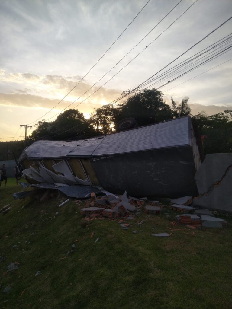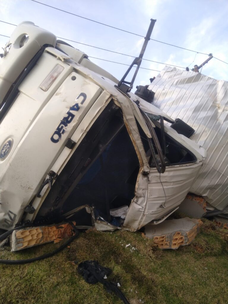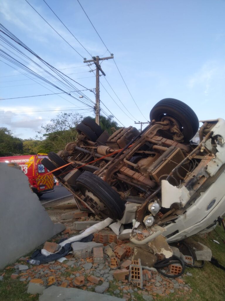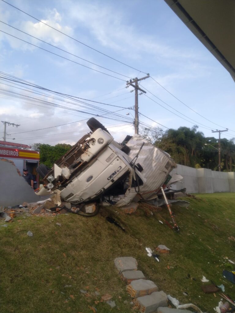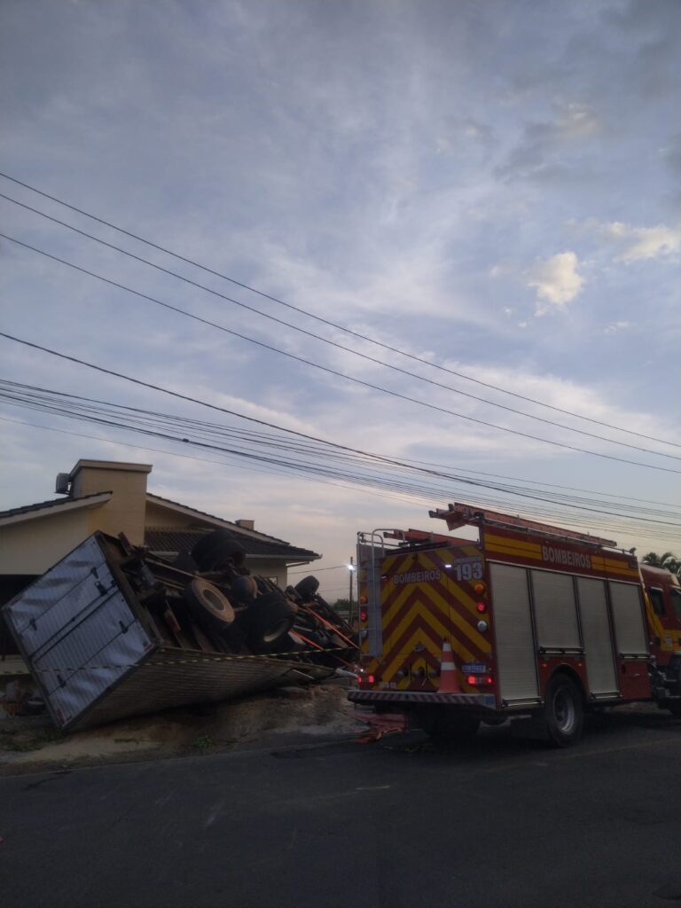 Um acidente de trânsito mobilizou equipes de resgate na tarde desta sexta-feira (21) na Rua Manoel João Machado, no bairro Colonial, em Criciúma. Um caminhão Ford Cargo, carregado com bananas, tombou lateralmente e invadiu o terreno de uma residência.