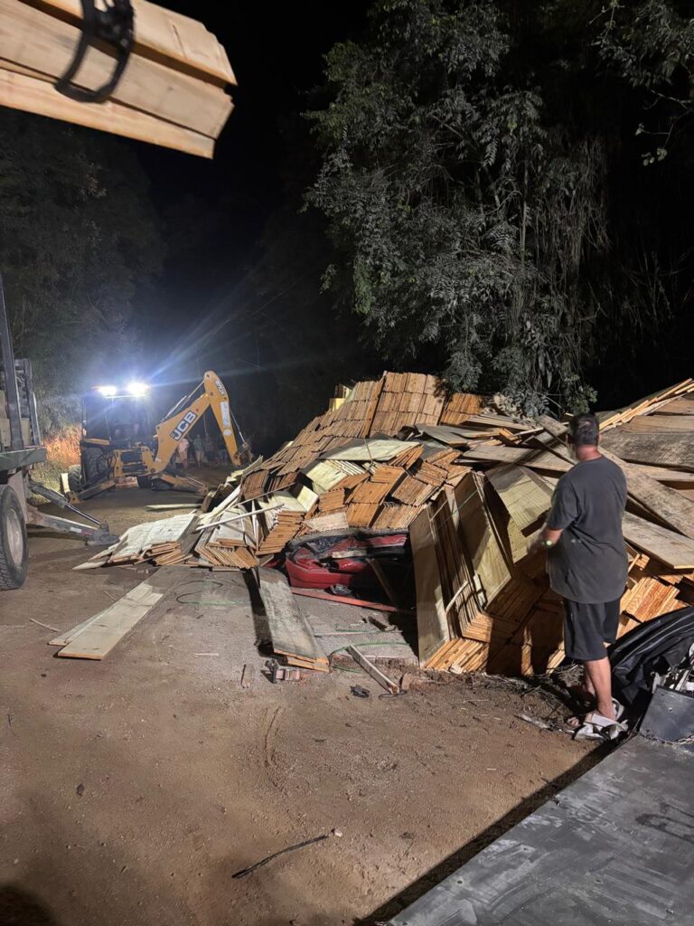 A força do impacto e o volume de madeira tornaram o resgate extremamente complexo. Foi necessário o apoio de maquinário pesado da Prefeitura de São Bonifácio para remover parte da carga e levantar a estrutura do caminhão, permitindo o acesso ao veículo. Somente após a estabilização da cena, os bombeiros utilizaram ferramentas hidráulicas para retirar os corpos das ferragens.