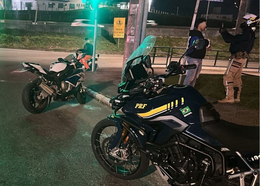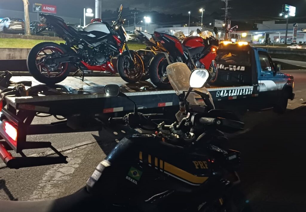 Policiais rodoviários federais flagraram cinco motocicletas esportivas de alta cilindrada circulando com dispositivos ilegais para ocultar a placa de identificação na BR-101, nos trechos de São José e Palhoça, na Grande Florianópolis.