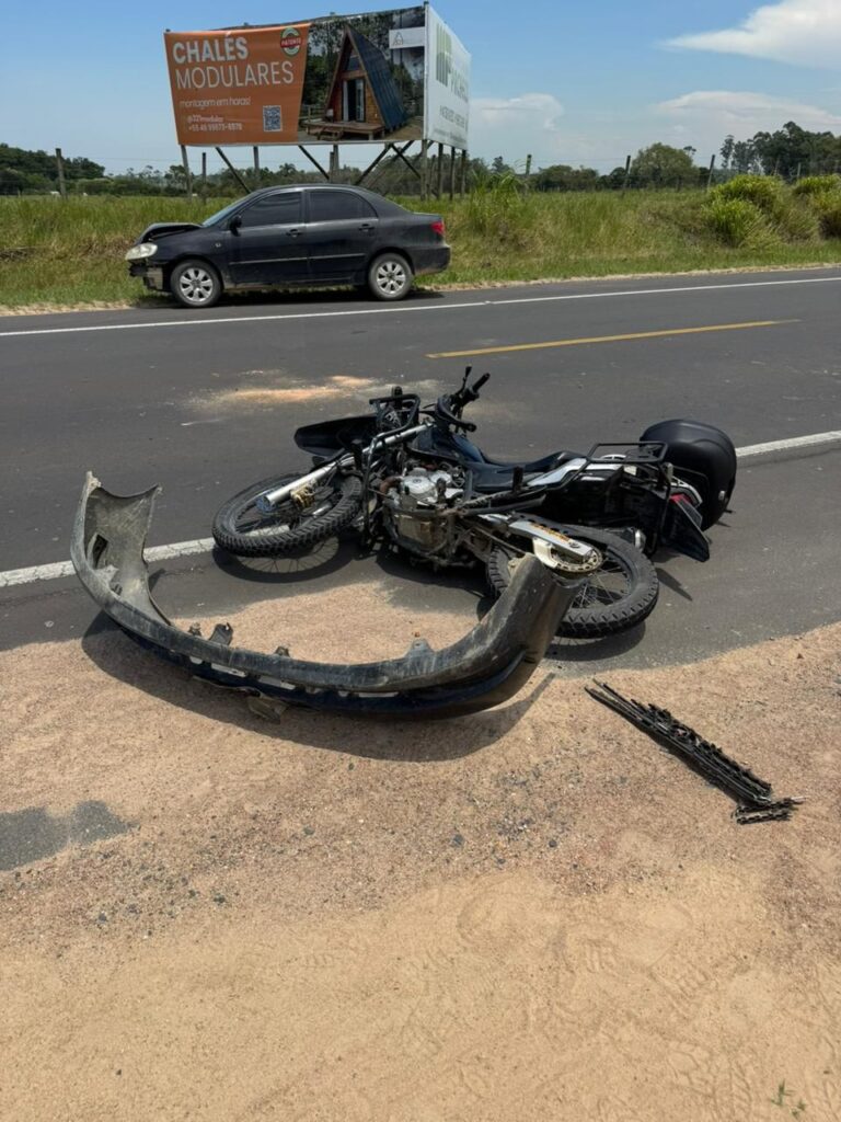 Uma colisão entre um automóvel e uma motocicleta foi registrada na tarde dessa quinta-feira (29) na SC-100 Claudino Abel Botega, no bairro Laranjal, em Jaguaruna. O acidente envolveu um carro modelo Corolla e uma motocicleta, ambos com placas do município.
