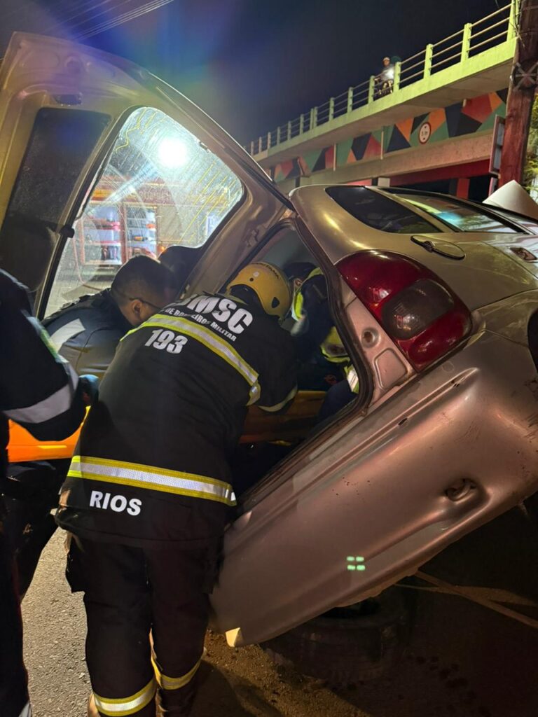 Após avaliação e procedimentos de atendimento pré-hospitalar, as duas vítimas que estavam no interior do Corsa foram retiradas em ângulo zero, com o uso de maca rígida. As três vítimas envolvidas no acidente foram encaminhadas ao Hospital São José para avaliação médica.