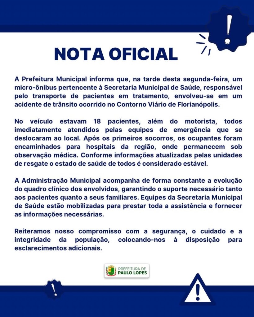 A administração municipal informou que acompanha de perto a evolução clínica das vítimas, prestando assistência às famílias. Equipes da Secretaria de Saúde estão mobilizadas para dar suporte e repassar informações aos envolvidos.