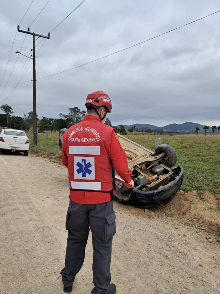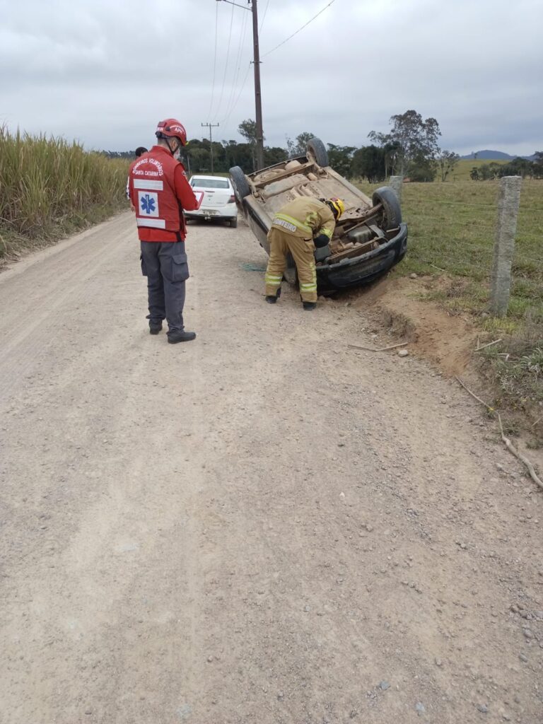 No local, os socorristas se depararam com um veículo Ford Ka, com placas de Sangão, tombado. A condutora, uma mulher de 55 anos, já estava fora do automóvel no momento da chegada da equipe de resgate e não apresentava ferimentos aparentes.