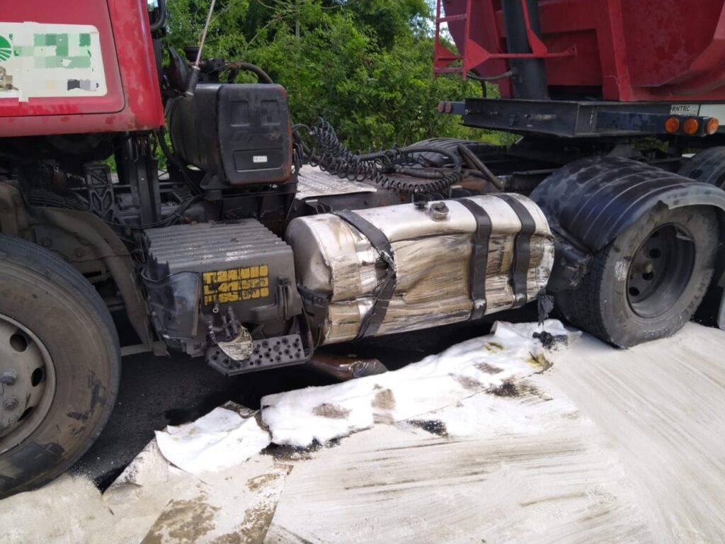 A colisão envolveu um caminhão Scania, um Peugeot 206 e um Volkswagen Gol. Com o impacto, um dos tanques de combustível do caminhão foi danificado, ocasionando o vazamento que se espalhou por cerca de 300 metros da pista.