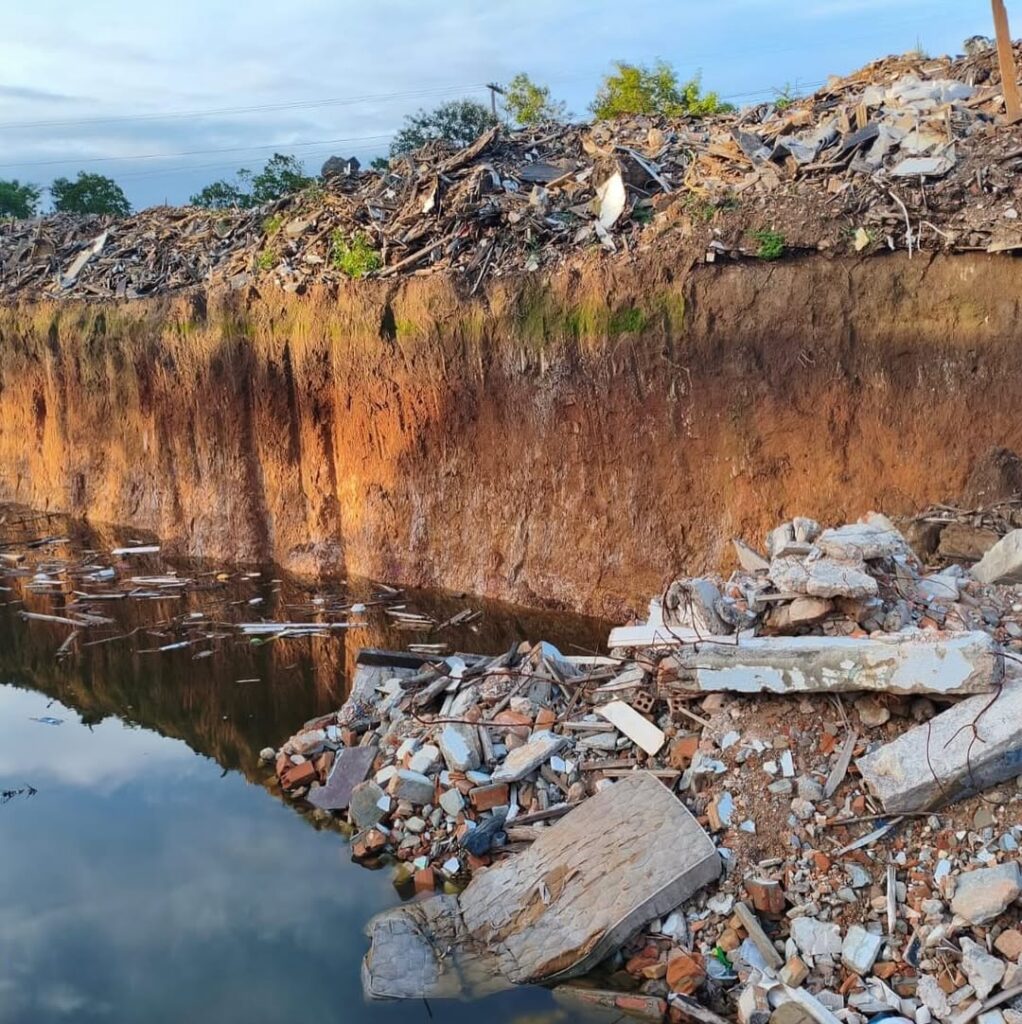 No local, os policiais encontraram uma grande cava aberta no pátio da empresa, com cerca de 720 m² de área e quatro metros de profundidade. A escavação atingiu o lençol freático, provocando afloramento de água. De forma irregular, o espaço estava sendo utilizado para depósito de diversos resíduos, entre eles tijolos, blocos de concreto, telhas de fibrocimento, latas de tinta e solvente, plásticos, gesso, isopor, madeiras, pisos cerâmicos, roupas, calçados, pneus, eletrodomésticos, vidros e ferragens.