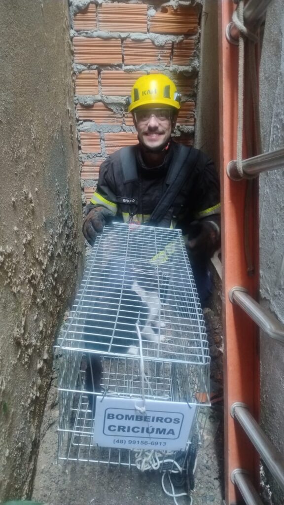 Um gato foi resgatado pelo Corpo de Bombeiros após cair de uma janela e ficar preso em um fosso sem saída nos fundos de um prédio, nesta terça-feira (7), no Centro de Criciúma.