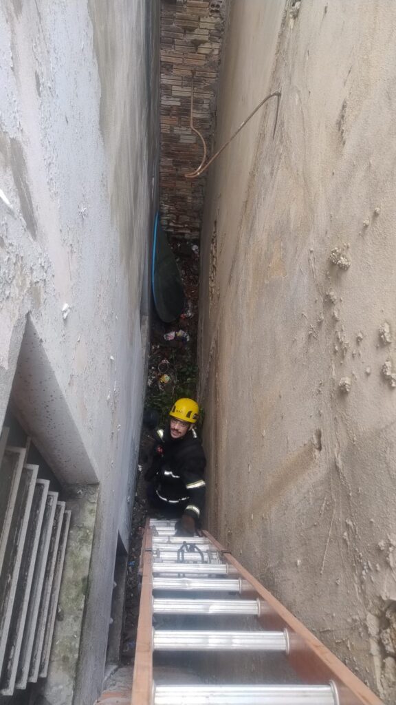 Um gato foi resgatado pelo Corpo de Bombeiros após cair de uma janela e ficar preso em um fosso sem saída nos fundos de um prédio, nesta terça-feira (7), no Centro de Criciúma.