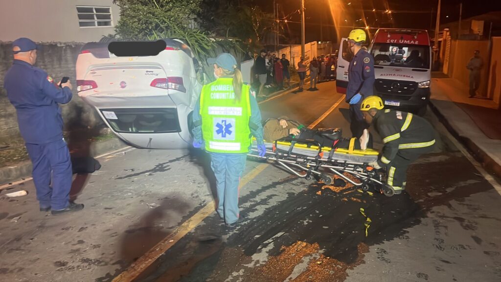 Uma idosa ficou ferida na noite dessa quarta-feira (13) após um acidente de trânsito que resultou no capotamento de um veículo na Rua Rainha da Paz, no bairro Ana Maria, em Criciúma. A ocorrência foi registrada às 21h43 e mobilizou equipes do Corpo de Bombeiros e do Samu.